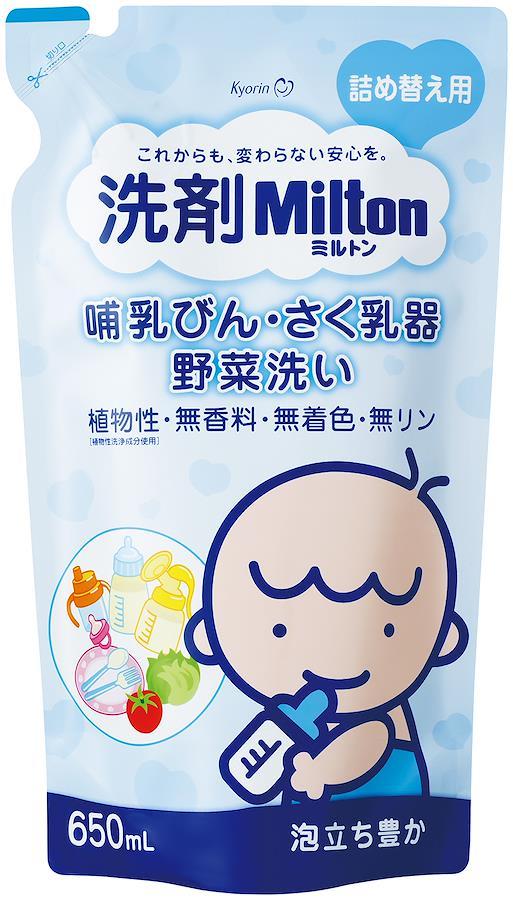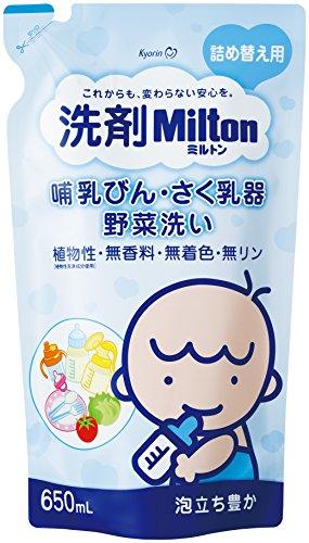 ●新生児の時から使えるMilton(ミルトン)の台所用合成洗剤です。●泡立ちよくスッキリしっかり洗え、すすぎもラクラク。●野菜や果物など赤ちゃんが口にするものも洗えます。●哺乳びん、さく乳器、乳首、おしゃぶり、おもちゃ、離乳食用食器、離乳食用野菜・果物などの洗浄に。●植物性(植物性洗浄成分使用)、無香料、無着色、無リン。●詰め替え用。●液性:中性●使用量の目安:水1Lに対し1.5ml(料理用小さじ1杯は約5ml)【ポンプボトルへの詰め替え方法】点線に沿ってハサミで注ぎ口を切り、注ぎ口をボトルに差込み、こぼれないようにゆっくりと全量を移しかえてください。強く握りしめると、中身が飛び出すことがあります。※必ず「洗剤Milton(ミルトン) 哺乳びん・さく乳器・野菜洗い」750mlポンプボトルに詰め替えてください。 商品サイズ (幅×奥行×高さ) :150×60×260mm 原産国:日本 内容量:650ml ブラント名: ミルトン メーカー名: 杏林製薬