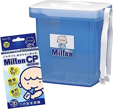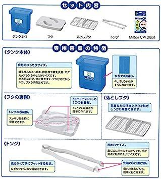 すぐに始められる哺乳びん除菌セット! ・タンク本体 ・フタ ・落としブタ ・トング ・ミルトンCP 36錠 ● ミルトン専用容器 【サイズ】 横幅24cm×高さ25cm×奥行き15cm 【容量】 4L ・哺乳びん6本分の消毒液が簡単に作れるミルトン専用容器。 ・哺乳びん、乳首を授乳直前まで溶液につけておくことができます。 ・付属の専用トング(哺乳びんハサミ)で安心して哺乳びんが取り出せます。 *底に沈んだものを掴んでも手が濡れません。 ・本体は水位線(目盛り 4L、2L)付き、上フタでは薬液の計量ができます。 ● ミルトンCP 36錠 【内容量】 36錠 【成分】 1錠(1.0g)中:ジクロルイソシアヌル酸ナトリウム 500mg、添加物:炭酸水素ナトリウム、アジピン酸、乾燥炭酸ナトリウム ・赤ちゃんの手では開けられない安心シート(Chile-Proof)で誤飲防止! ・軽くてスマートな錠剤は持ち運び・保管に便利。 ・水2リットルに対