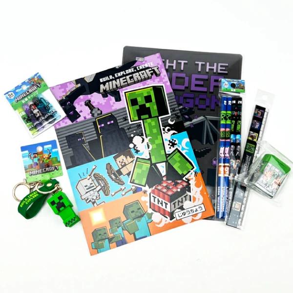 大人気ゲーム、マインクラフトの文房具セットです。学校で、塾で、大好きなマイクラといつでも一緒!クリスマスや入学のプレゼントにも。(内容例:鉛筆キャップ、定規、下敷き、鉛筆、鉛筆削り、キーホルダー、自由帳) ※絵柄、内容はランダムです。