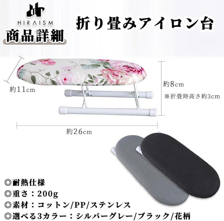 「商品内容」折り畳みアイロン台 <サイズ> 長さ:26cm 幅:11cm 高さ:8cm(折り畳み時:3cm) 重量:200g 材質:コットン、PP、ステンレス 備考:耐熱仕様