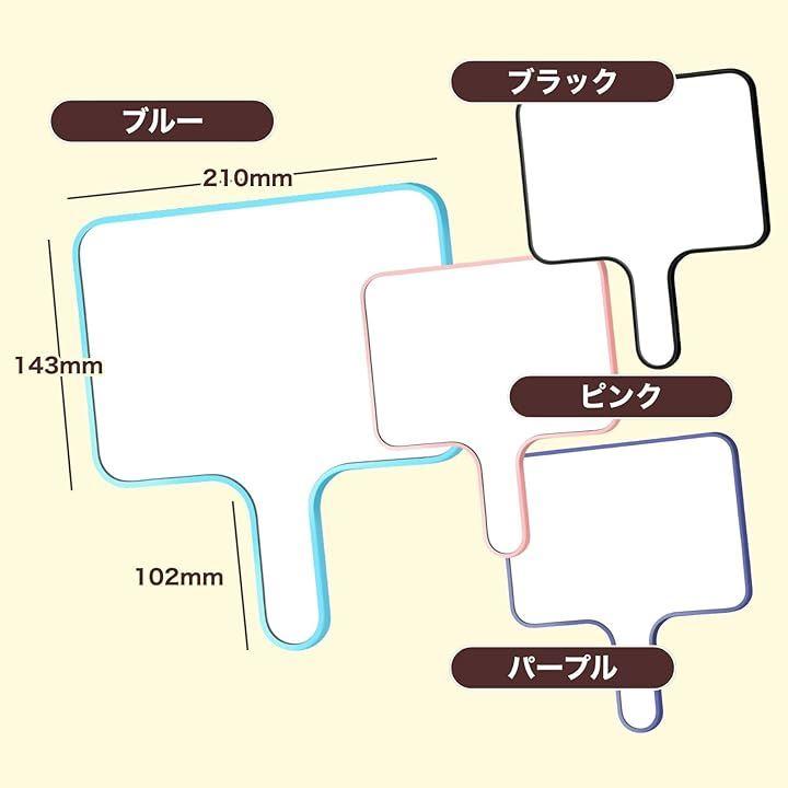 「好きなカラーが選べる.」 学校やオフィスもOK.*セット内容:ミニホワイトボードx2*カラー:ピンク,ブルー,ブラック,パープル*サイズ:210mmx143mm(ボード)/102mm(持ち手)*重さ:110g*素材:プラスチック