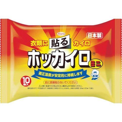 【使用上の注意】●低温やけどは、体温より高い温度の発熱体を長時間あてていると紅班、水疱等の症状をおこすやけどのことです。なお、自覚症状をともなわないで低温やけどになる場合もありますのでご注意ください。【低温やけど防止のための注意】●肌に直接貼らないでください。●就寝時の使用や、長時間同じ所での使用はお避けください。また、幼児や身体のご不自由な方、肌の弱い方等が使用される場合は、特にご注意ください。●肌の弱い方は低温やけどにご注意ください。●熱すぎると感じたときはすぐにはがしてください。●幼児または身体のご不自由な方等、自分ですぐにはがせないような方の使用は、十分にご注意ください。●肌に赤み、かゆみ、痛み等、やけどの症状がおきたときはすぐに使用を中止し、医師にご相談ください。●ふとんの中、こたつの中、及びストーブ等の暖房器具の近くでは使用しないでください。●糖尿病等で血行障害のある方は、熱さを感じにくいことがありますので特にご注意ください。●本品は人体の保温用です。用途以外には使用しないでください。●くつの中やくつ下(足の裏)には使用しないでください。●粘着剤でいたむ衣類(毛足の長いもの等)や高級な衣類には使用しないでください。●強く振ったり、もんだりしないでください。●あたたかさを感じなくなったら必ずはがしてください。●本品は食べられません。●使用後は市区町村の区分に従ってお捨てください。●適正温度が安定的に持続します。●最高温度60度、平均温度50度、持続時間10時間(40度以上を保持し、持続する時間)●身体の保温に。●スポーツ観戦やレジャー、戸外等、寒い場所での保温に。●貼るカイロ●ミニサイズ●サイズ:98mm×65mm●10個入り※肌に直接貼らないでください。【使用方法】●個装袋を開封し、シールをはがして、もまずに衣類の上に貼ってご使用ください。●使用後は静かにはがしてください。 商品サイズ (幅×奥行×高さ) :165×40×100mm 原産国:日本 内容量:10個入 ※商品のデザインや仕様は予告なく変更となる場合があります。予めご了承くだいさい。