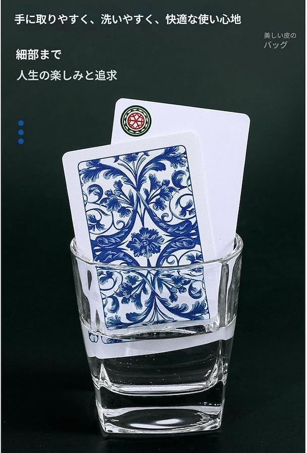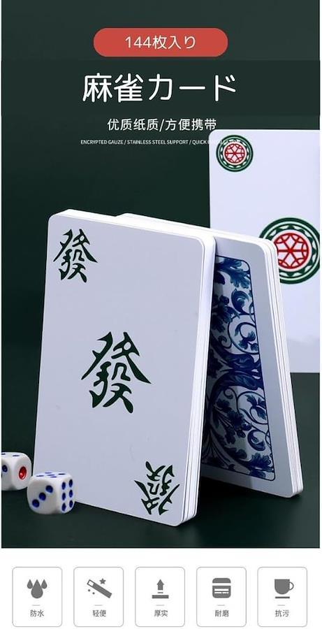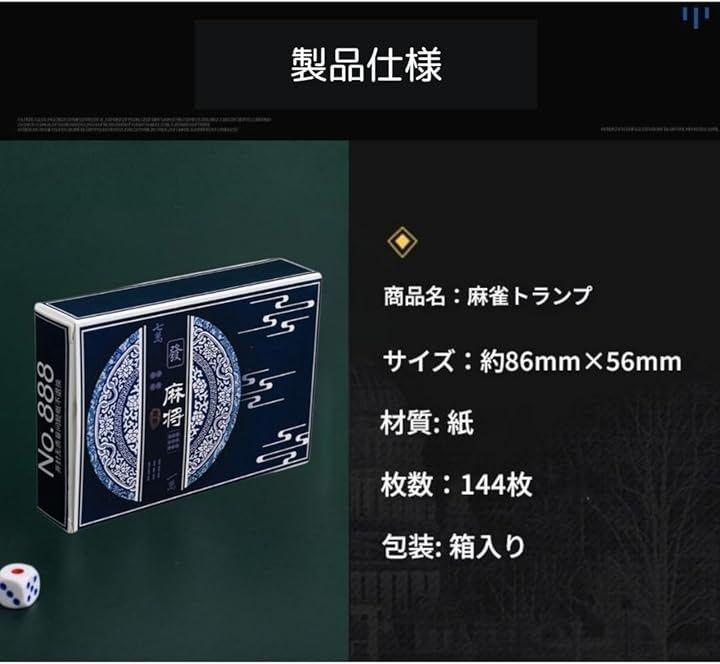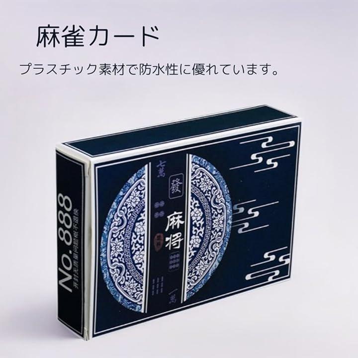 「製品仕様」枚数144枚(萬子36枚 筒子36枚 索子36枚 字牌28枚 花牌8枚) カードサイズ:8.6x5.6cm