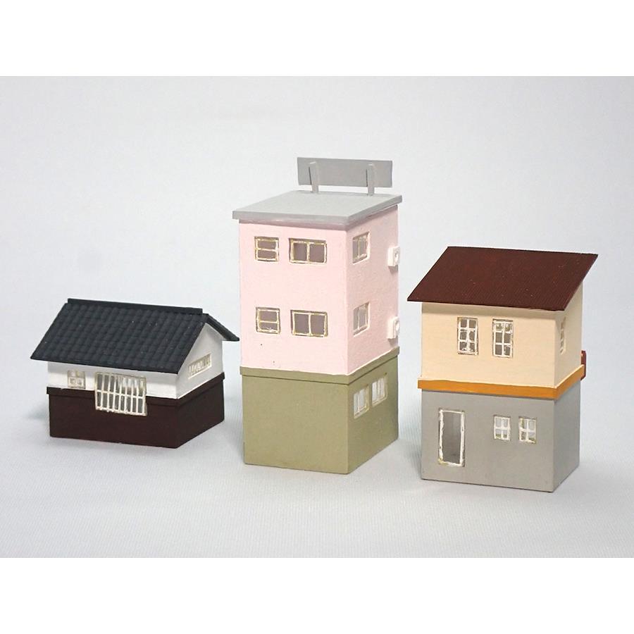 日本建築、日本の家屋をイメージした建物3軒セット●建物サイズ(約)幅33mm × 奥30mm × 高さ26mm幅24mm × 奥30mm × 高さ58mm幅30mm × 奥28mm × 高さ42mm