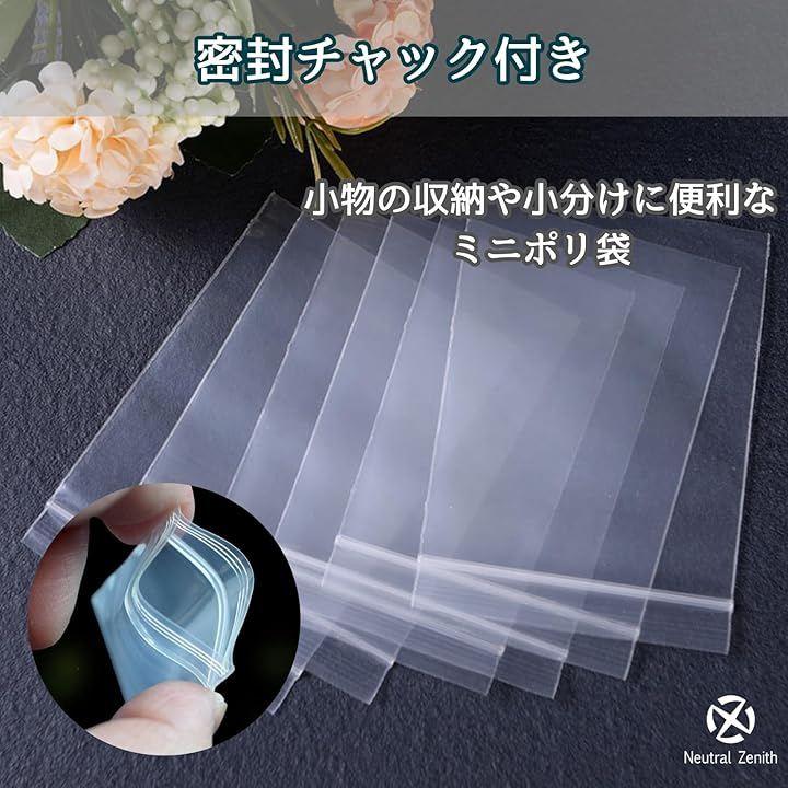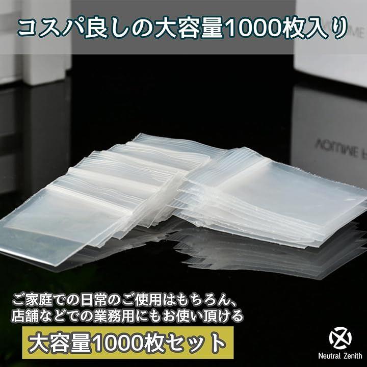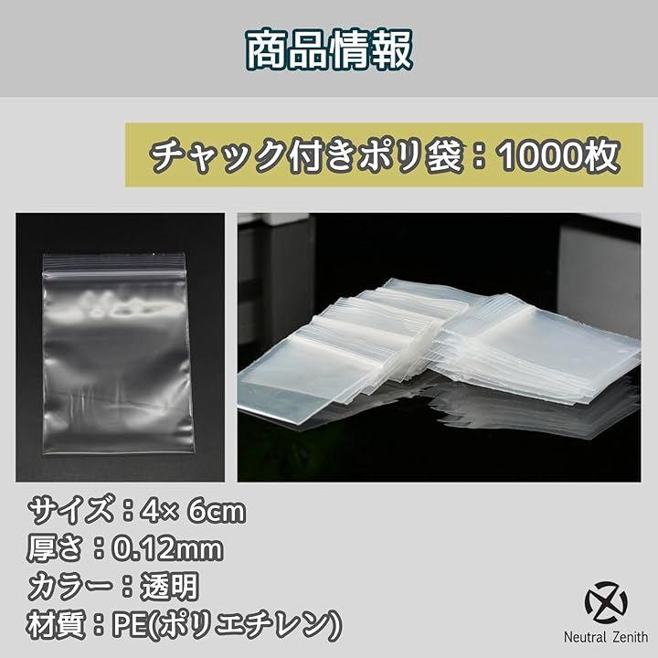 「商品詳細」 ・内容:チャック付きポリ袋 1000枚 ・サイズ:4x6cm ・厚さ:0.12mm ・カラー:透明 ・材質:PE(ポリエチレン)