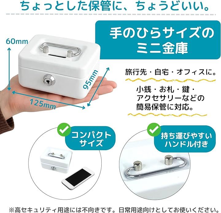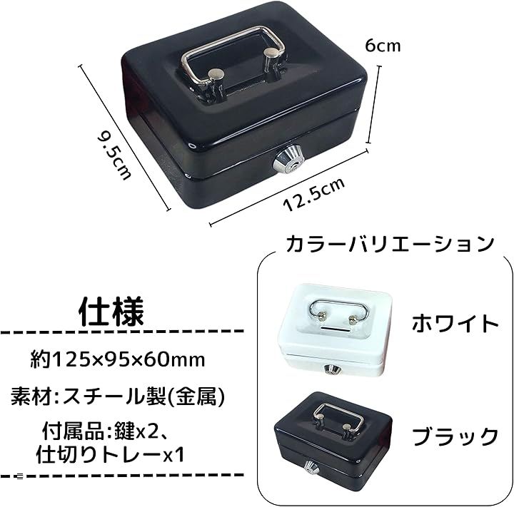 「仕様およびご利用上の注意」サイズ:約125x95x60mm、カラー:ホワイト、素材:スチール(金属製)、付属品:鍵x2、仕切りトレーx1、使用用途例:小銭収納/貯金箱/鍵の保管、ご注意:本製品はあくまで簡易金庫です。