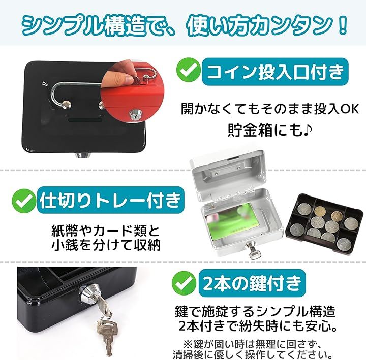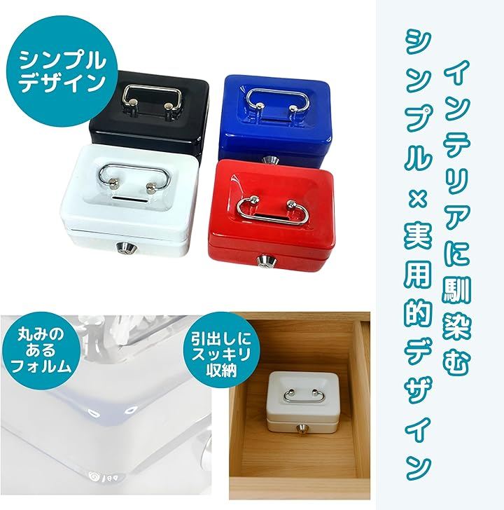 「用途を見極めて使えるミニ金庫」コンパクトながら鍵付きで、小銭・紙幣・鍵などの簡易保管に対応するミニ金庫です。