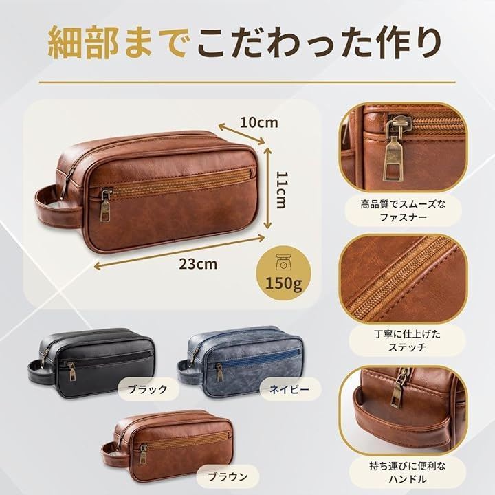 「スペック」 *本体サイズ:縦11cm、横23cm、厚さ10cm、*表地:高品質ソフトPUレザー(合成皮革)、*裏地:ナイロン、*重量:150g、*収納スペース:メインスペース1、外側ファスナーポケット1、内側ファスナーポケット1