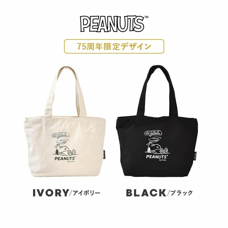 【ミニトートバッグ】PEANUTS75周年を祝う限定デザインのミニトートバッグ。天面ファスナー仕様で、貴重品が飛び出さず安心◎A5サイズ入るサイズでマチもあるからたっぷり収納可能。お仕事やお出かけにぴったりです。