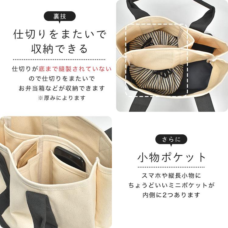 【収納ミニトート 】便利な仕切り付きで整理整頓がしやすいバッグです。仕切りが底まで縫製されていないので、仕切りをまたいでお弁当箱などが収納できます。小物ポケット付きで小物の仕分けもしやすい◎