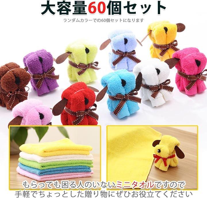 「商品内容」プチギフト用ミニタオル:60個入 犬型サイズ(約):6x6x8cm タオルサイズ(約):20x20cm 重量(約):12g 素材:繊維布 カラー:ランダム (ミックスカラー)