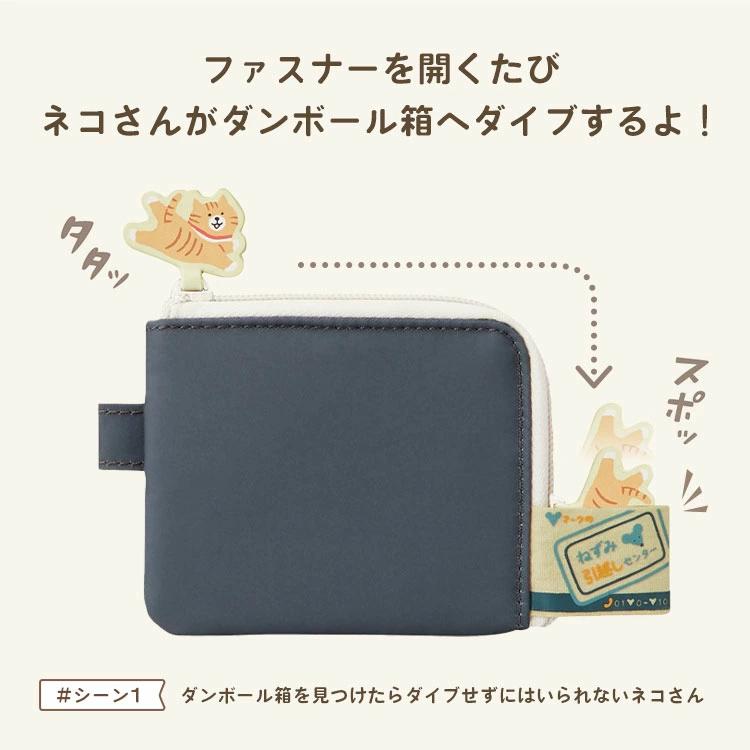 【フラットカードポーチ】気ままに暮らすネコさんたちの日常のワンシーン(にゃんシーン)がファスナートップで表現されました。ファスナーを開けるとダンボール箱にネコさんがダイブ!大きく開くL字ファスナーでカードケースやコインケースに。クッションが入っているので中に入れたものが傷つきにくいです。