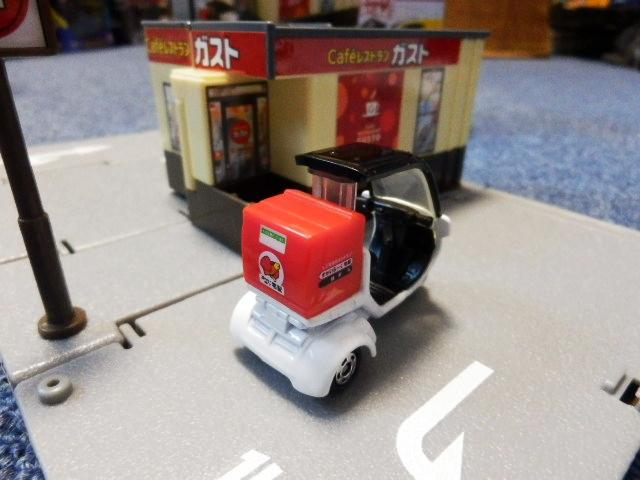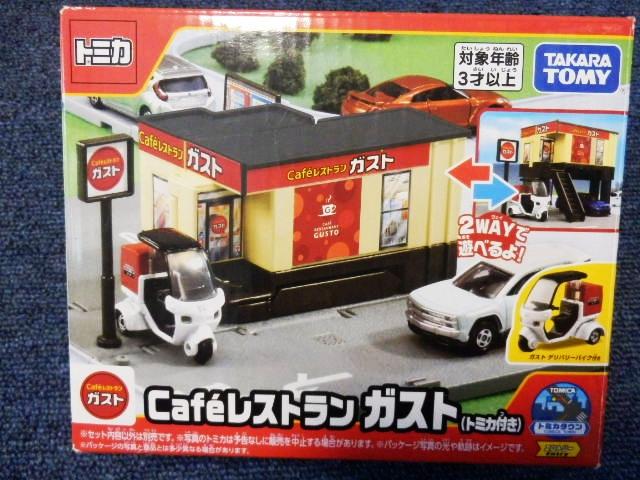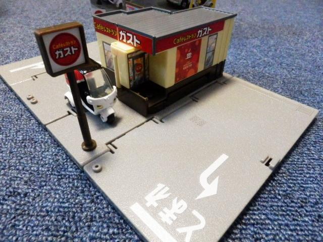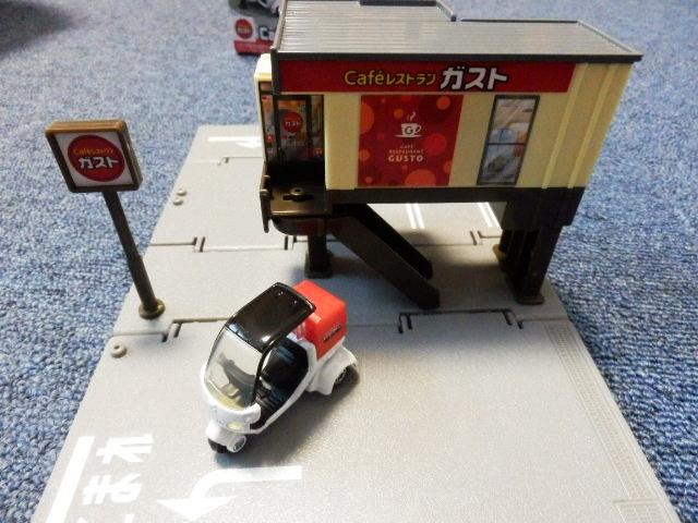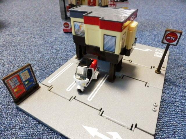 スケールサイズ 1/64日本製 トミカ製 ダイキャスト製ミニカー組み立て式のジオラマセットです。レストラン「ガスト」のジオラマセットです。1階式と2階建ての2通りの組み立て方ができます。ガストのデリバリーバイク付きです。