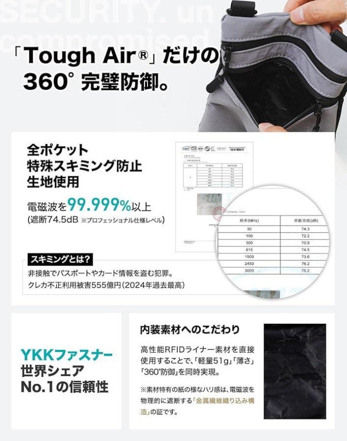 「鉄壁の360°スキミング防止機能」 全ポケット・全面に特殊なRFIDブロッキング素材を採用。