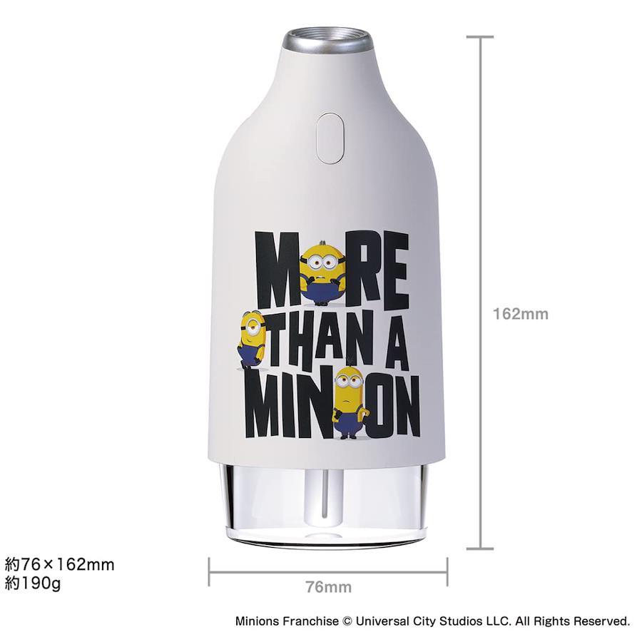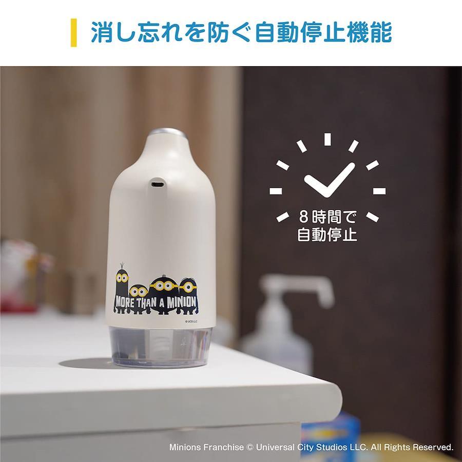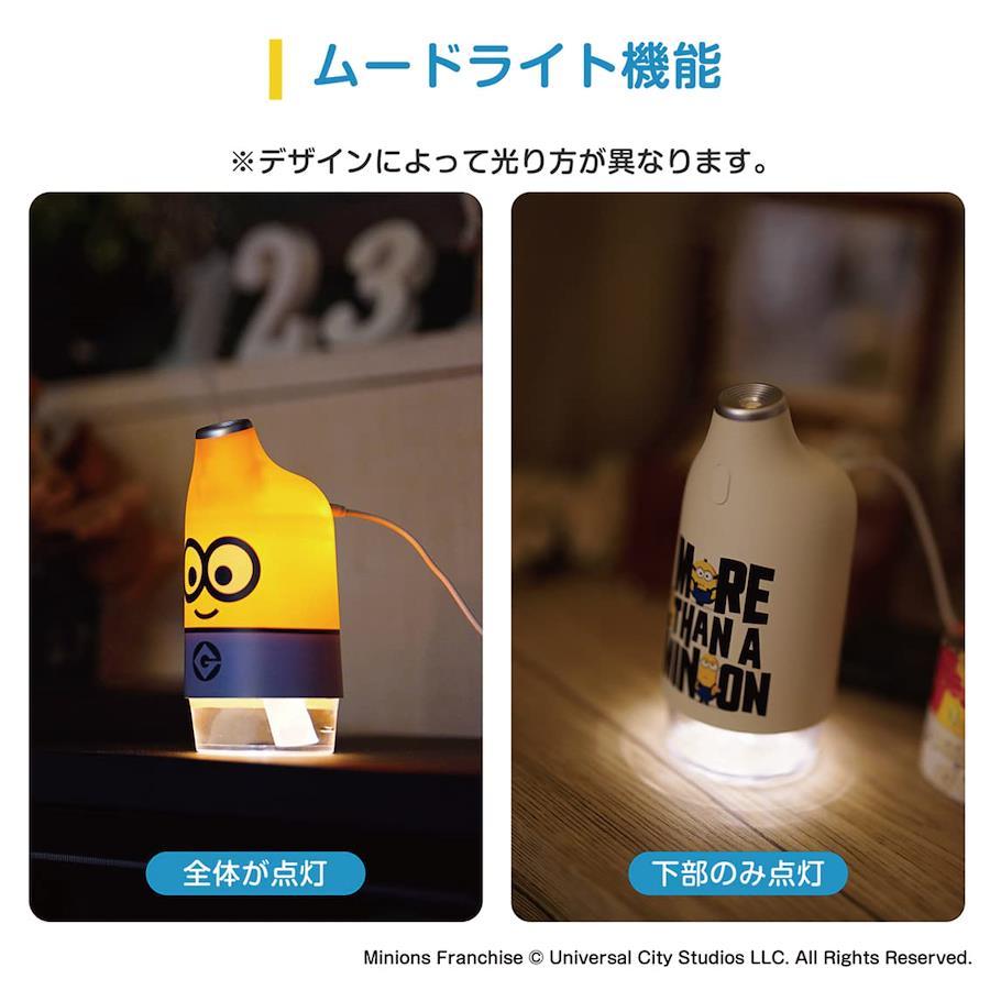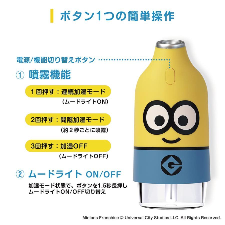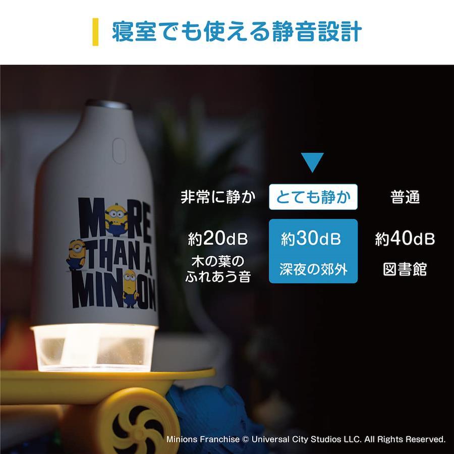 3営業日以内に発送≪新品未開封品≫:【インテリアに溶け込むミニオンデザイン】ホワイトベースにミニオンズと文字を施したシンプルなデザインの卓上加湿器(USB給電式)です。[本商品はUniversal Studios Licensing LLC(ユニバーサル・スタジオ・ライセンシングLLC)との商品化契約に基づき、株式会社アピロスが企画・制作した商品です。【ムードライト/水こぼれ防止】本体下部の給水タンク部分が柔らかく光ります。静音設計(30dB)と水こぼれ防止のロック機構により寝室でも安心して使えます。【加湿モード切替可能/自動停止機能搭載】連続加湿モードと約2秒ごとに約3秒間噴霧する間隔加湿モードを搭載しているため、お部屋の状態や好みに合わせて加湿ができます。また、約8時間で停まる自動停止機能により消し忘れを防ぎます。その他、USB給電式のため、付属のケーブルを使って、モバイルバッテリーやパソコンからの給電も可能です。(バッテリーは非搭載)【製品特徴】連続加湿モード(約6-7時間)、間隔加湿モード(約12-14時間)、自動停止機能搭載(約8時間)、USBケーブル(同梱)でモバイルバッテリーやパソコン給電可能、※バッ