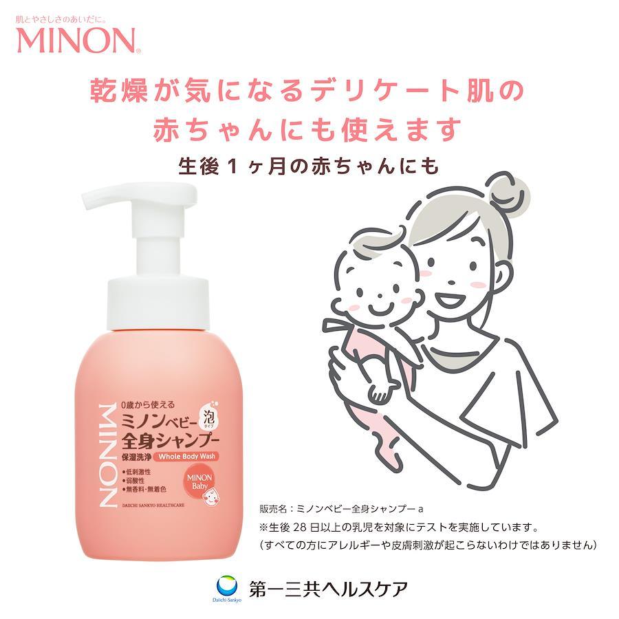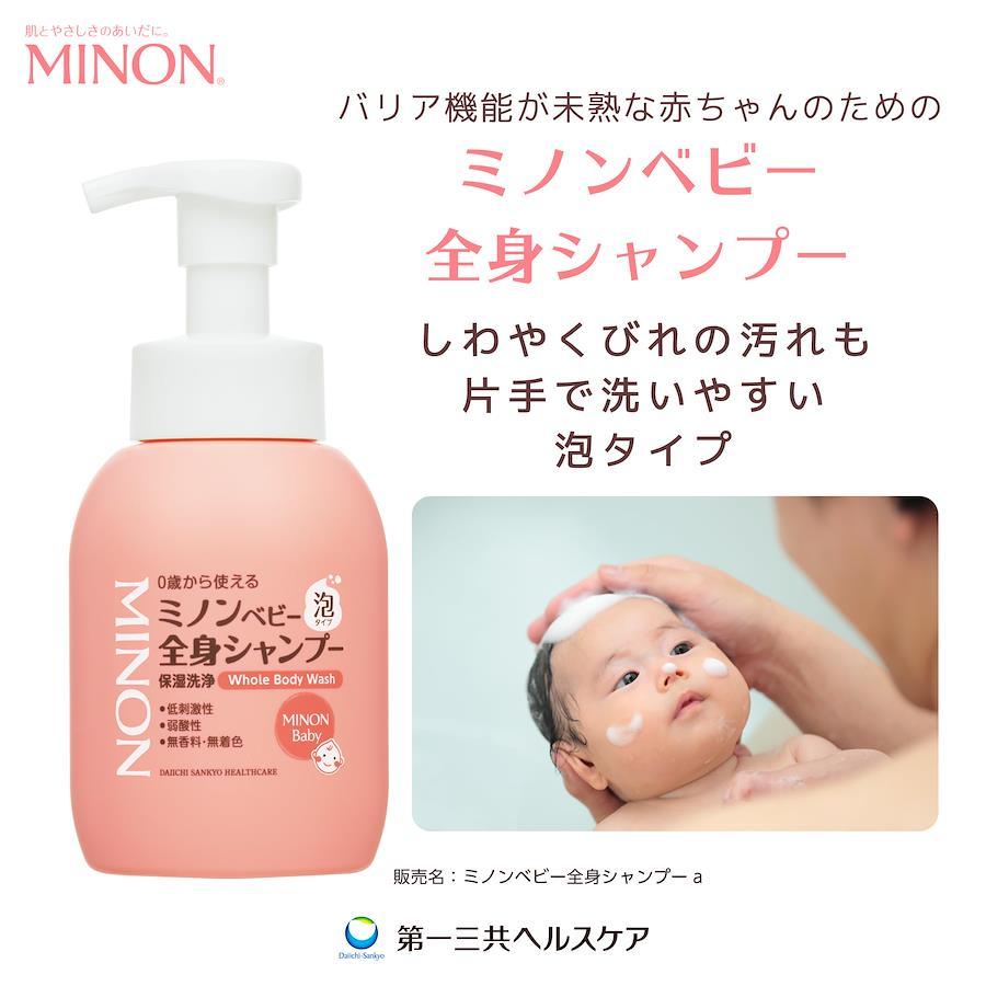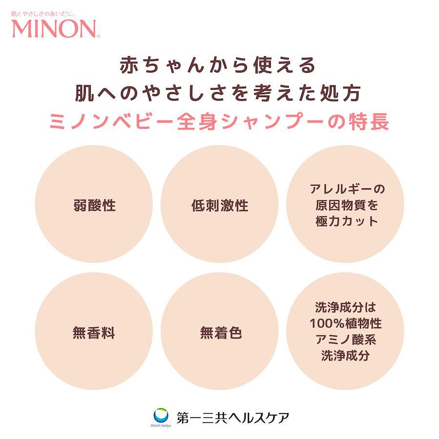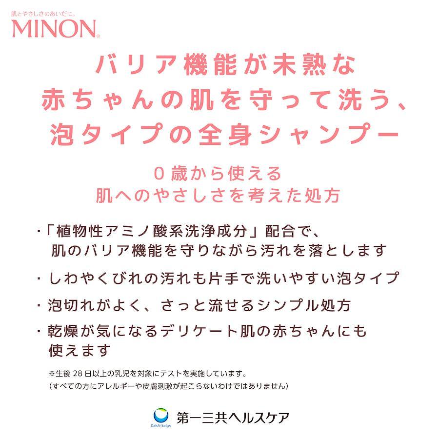 MINON(ミノン) ベビー全身シャンプー 泡タイプ 350mLブランド MINON(ミノン)商品の形状 液体ヘアタイプ 全髪質香り 無香料液体容量 350 ミリリットルタイプ: 泡タイプ商品サイズ (幅×奥行×高さ): 76mm×76mm×170mm内容量: 350ml原産国: 日本ブラント名: MINON(ミノン)商品紹介お肌に合わないときや、傷やはれもの・湿しん等、異常のある部位にはお使いにならないで下さい。使用中や使用後、皮膚や頭皮に赤み・はれ・かゆみ・刺激等や目の異常があらわれた場合は使用を中止し、専門医等に相談して下さい。そのまま使用を続けますと症状を悪化させることがあります。目に入らないようご注意下さい。万一、目に入った場合は、すぐに水又はぬるま湯で洗い流して下さい。乳幼児の手の届かない場所に保管して下さい。直射日光の当たる所や極端に高温又は低温の所には保管しないで下さい。デリケートなカサカサ肌タイプの赤ちゃんへバリア機能が未熟な赤ちゃんの肌を守って洗う保湿洗浄[植物性アミノ酸系洗浄成分]配合洗浄成分はアミノ酸系洗浄
