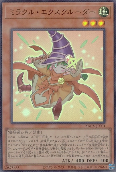 ■搭載パック:書籍特典■収録:プロモーションカード■■レアリティ:ウルトラレア■種類:効果モンスター■属性:地■種族:魔法使い族■星(レベル、ランク):3■攻撃力:400■守備力:400■リンク:‐■リンク方向:‐■ペンデュラムレフト:‐■ペンデュラムライト:‐■■シリーズ:書籍特典■効果テキスト:このカード名はルール上「E・HERO」カードとしても扱う。このカード名の①②③の効果はそれぞれ1ターンに1度しか使用できない。①:このカードが手札に存在する場合、デッキから「N」モンスター1体を墓地へ送って発動できる。このカードを特殊召喚する。②:このカードが召喚・特殊召喚した場合に発動できる。デッキから「E・HERO」モンスターのカード名が記された魔法・罠カード1枚を手札に加える。③:このカードが墓地へ送られた場合、相手の墓地のカード1枚を対象として発動できる。そのカードを除外する。■ペンデュラムテキスト:‐