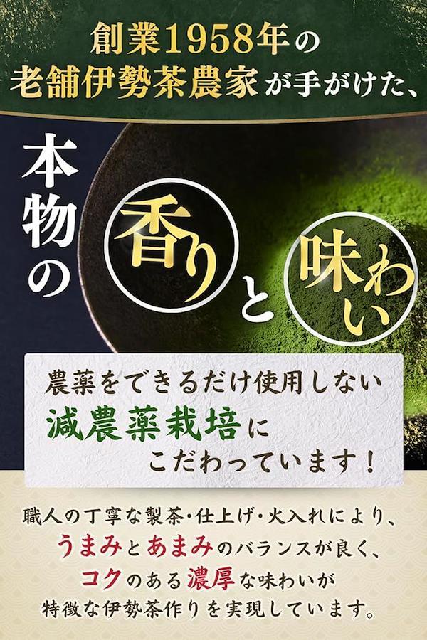 「創業1958年の老舗茶農家製造」創業から60年以上にわたる歴史を受け継ぐ伊勢茶農家が厳選したブランド茶葉「伊勢茶」だけを使用し、真心込めて丁寧に仕上げました。