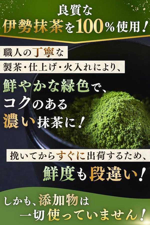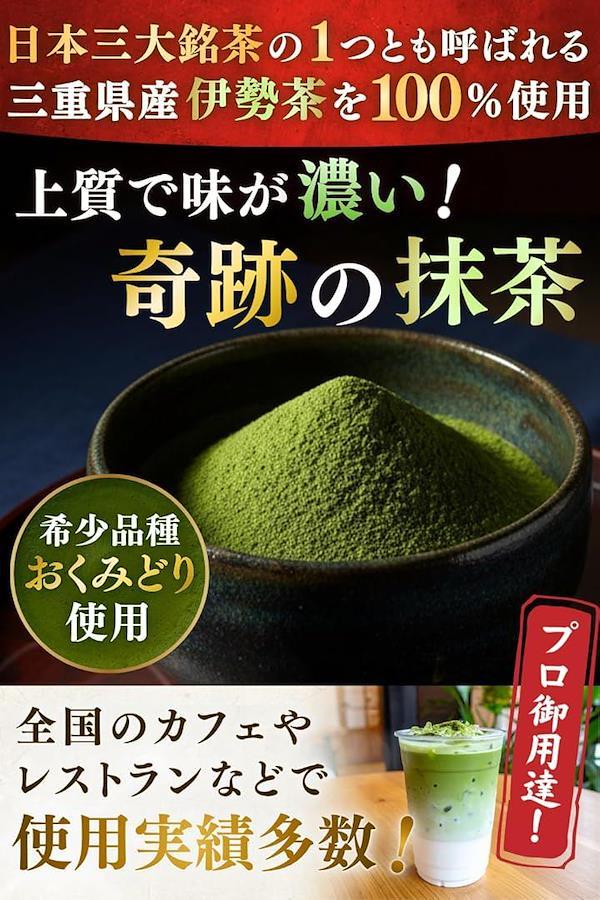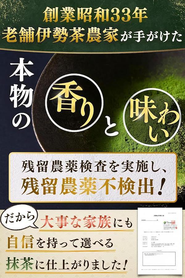 「創業昭和33年の老舗茶農家製造」創業から60年以上にわたる歴史を受け継ぐ茶農家が真心込めて作った、日本三代銘茶の1つとも呼ばれるブランド茶葉伊勢茶だけを使用している奇跡の抹茶です。