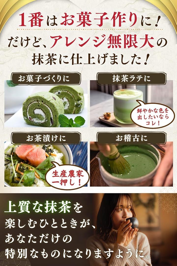 「賞味期限は製造日から1年」ごゆっくりお使いいただけるよう、賞味期限が残り6ヶ月以上の期間がある抹茶パウダーのみをお届けします。