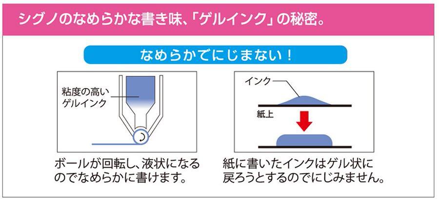 【シグノのなめらかな書き味、ゲルインク】キャップ式ゲルインクボールペン、シグノの替芯です。優れた耐久性と耐光性すぐれたゲルインクによりなめらかな書き味を実現しました。顔料インクのため、水ににじまず、描色あせにくく、いつまでも鮮やかな描線が残ります。