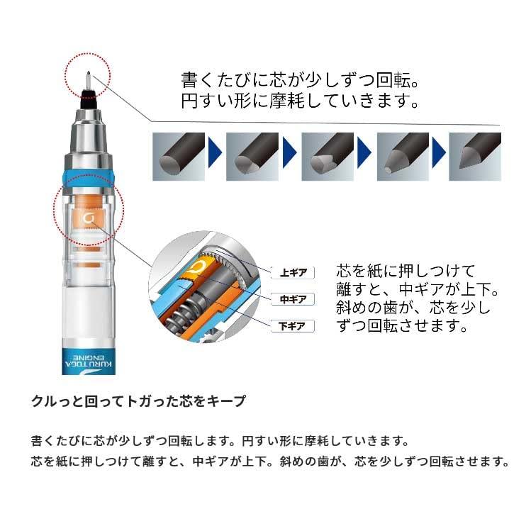 ○一定の細さ・濃さでキレイな文字を書きたいときには、“クルトガモード”、安定した筆記感でたくさん書きたいときには、“ホールドモード”と切り替えて使うことができます。○「芯が回ってトガり続ける」“クルトガモード”と「安定した筆記感」の“ホールドモード”を切り替え○にぎりやすさを科学したやわらかゲルグリップ○uni αGELのやわらか触感は集中力をキープ○ピタッとしたにぎり心地で、長時間の使用でも快適○芯が回ってトガり続ける「クルトガエンジン」搭載○クルっと回ってトガった芯をキープ○細く、クッキリ書き続けられる。
