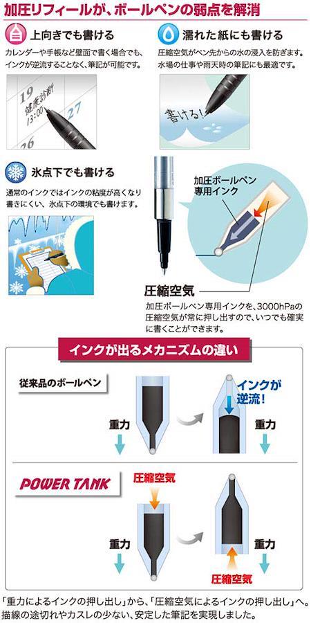 特徴空気のチカラで書きつくす。加圧ボールペン専用インクを圧縮空気で押し出すことで、トラブルの許されない筆記シーンをしっかりサポート。屋外や立ち仕事など、あらゆる場面で機能を発揮します。