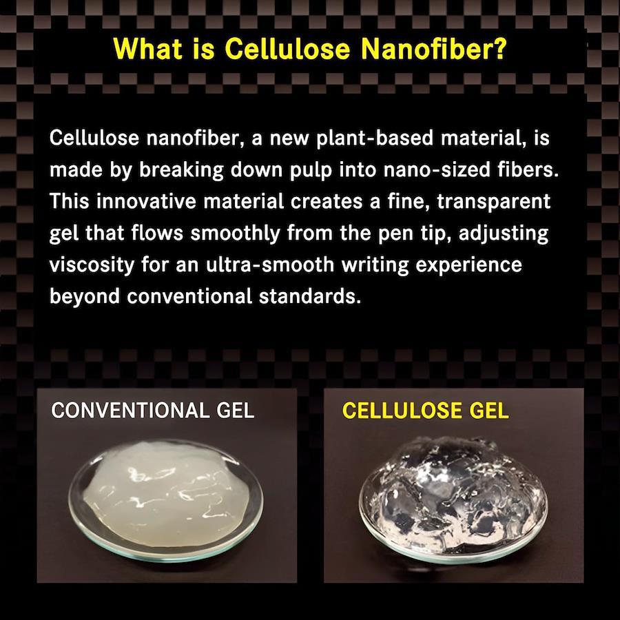 次世代素材「セルロースナノファイバー」配合新インク。速書きでもかすれにくく、インク溜まりができにくい。耐水性・耐光性に優れています。