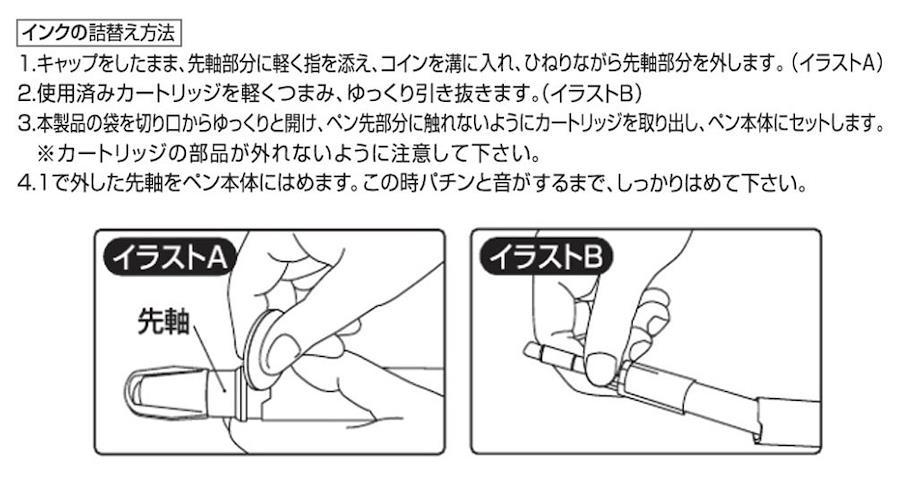 直液タイプのように、かすれず、最後までしっかり鮮やかに筆記可能で、用途に合わせて丸芯と角芯を使い分け可能です。簡単に詰替え可能なカートリッジ式です。