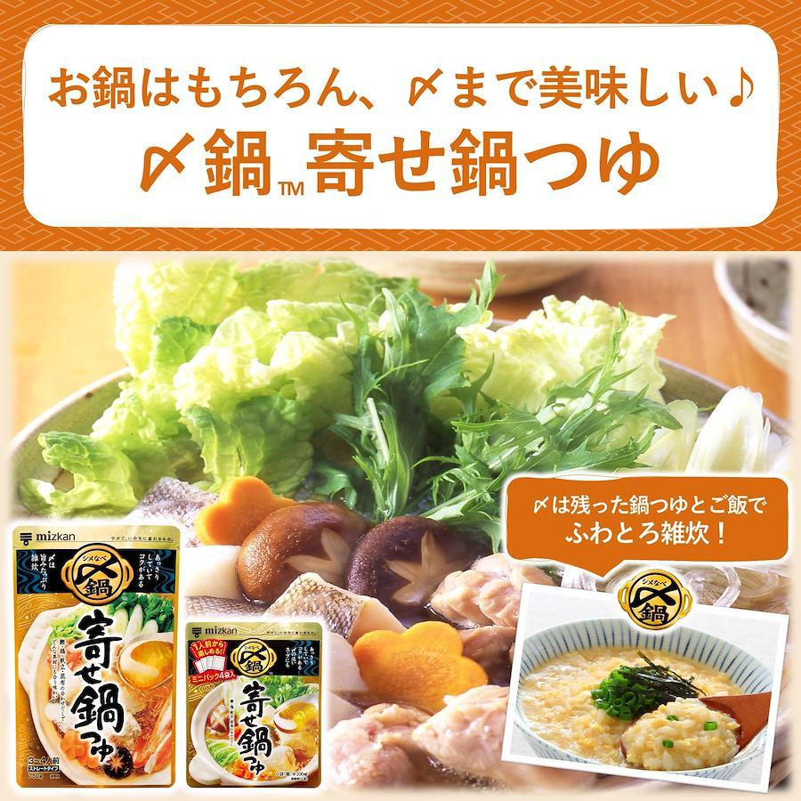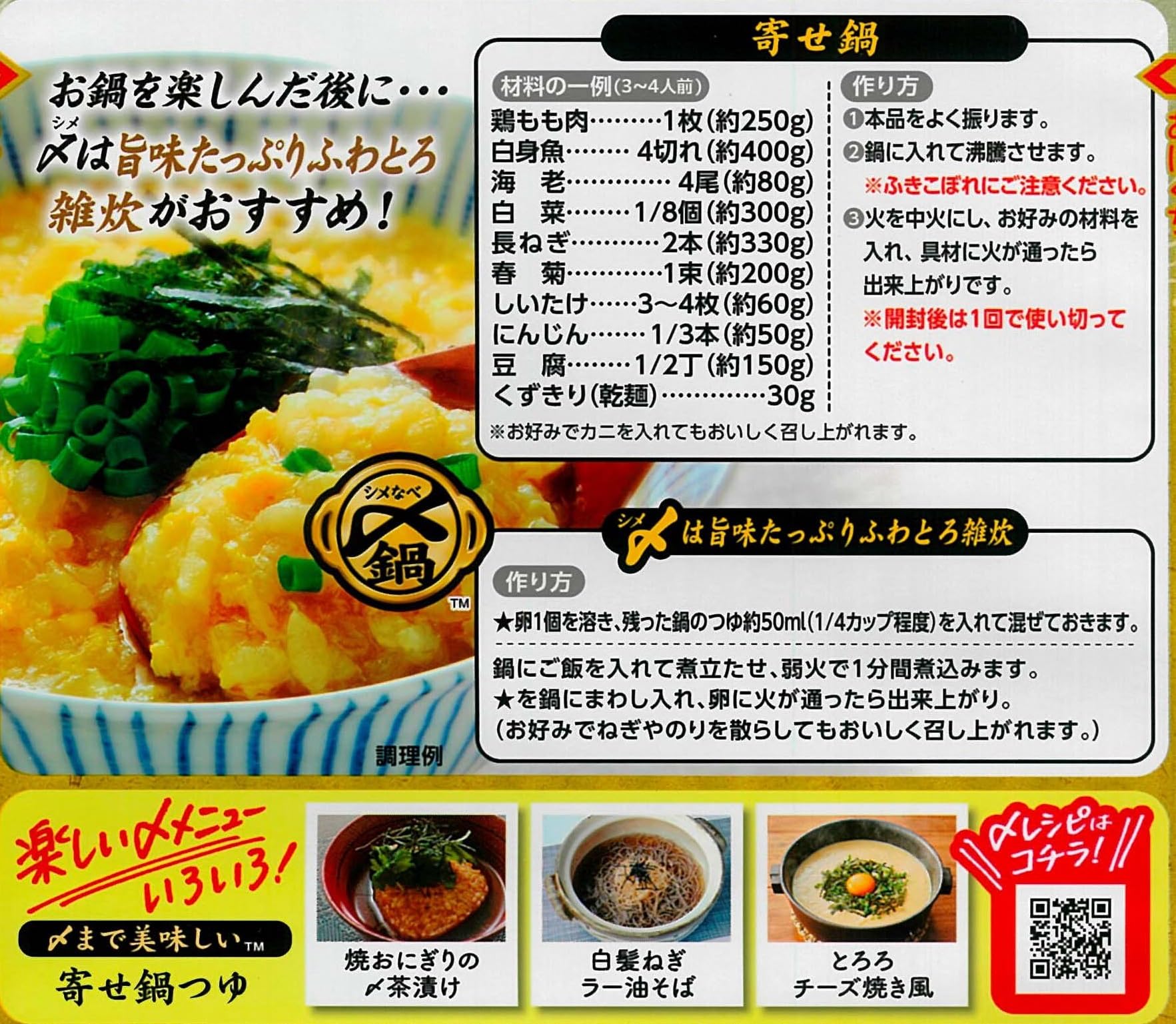 コクがある味わいなので、お鍋はもちろん、〆まで美味しく食べられる鍋つゆシリーズです。鰹・昆布・帆立・鶏の4つのだしを合わせた、あっさりしていてコクがある、寄せ鍋つゆです。鰹・鶏・帆立・昆布の合わせだしでどんな具材にも合う味わいです。〆はごはんを入れて旨みたっぷり雑炊を美味しくいただけます。