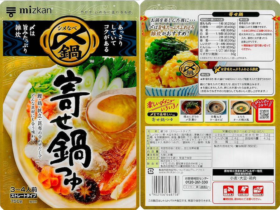 原材料:しょうゆ(小麦・大豆を含む)(国内製造)、果糖ぶどう糖液糖、米発酵調味料、食塩、醸造酢、アミノ酸液(大豆を含む)、鶏がらだし、こんぶだし、かつおエキス、ほたてだし、酵母エキス、粉砕かつおぶし/調味料(アミノ酸等)、乳酸栄養成分:1人前(214g)当たり エネルギー:21kcal、たんぱく質:2.4g、脂質:0g、炭水化物:3.2g、食塩相当量:4.3gアレルゲン:小麦、大豆、鶏肉ミツカンの 〆鍋 シリーズ〆は 雑炊 を推奨。 鍋の素 としてだけでなく 雑炊の素 や うどんスープ 等、 スープ の素 としてもお使いいただける なべつゆ です【重要】メーカーによる商品リニューアルに伴いパッケージ(内容量も含む)変更が行われた場合、新パッケージでお届け致します事ご了承願います。