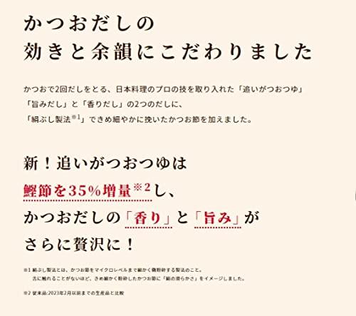 かつおで2回だしをとる日本料理のプロの技を取り入れた「追いがつおつゆ」。かつおだしの効きにこだわり、「旨みだし」と「香りだし」の2つのだしに、「絹ぶし製法※」できめ細やかに挽いたかつお節を加えました。かつおだしが効いているので、本格的な料理が簡単に仕上がります。甘さを抑え、 すっきりとした味わいに仕上げました。濃縮2倍タイプのめんつゆです。麺つゆはもちろん、 煮物やお鍋などにもよく合います。 ※絹ぶし製法とは、かつお節をマイクロレベルまで細かく微粉砕する製法のこと。 舌に触れることがないほど、きめ細かく粉砕したかつお節に「絹の滑らかさ」をイメージしました。