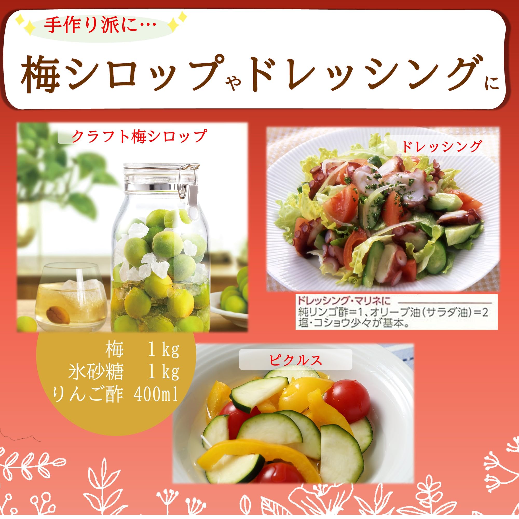 商品紹介 国産りんご果汁だけを原料にした、まろやかな風味とソフトな口あたりのお酢(りんご酢)です。リンゴ酢ドリンク(飲むお酢、お酢ドリンク、りんご酢ドリンク、ビネガードリンク)やドレッシング・マリネ等の洋風料理に最適です。【使用方法】リンゴ酢ドリンクに・・・純リンゴ酢=大さじ1、ハチミツ=大さじ1、冷水=コップ3/4(150ml)ドレッシング・マリネに・・・純リンゴ酢=1、オリーブ油(サラダ油)=2、塩・コショウ少々が基本。 原材料・成分 りんご果汁(国内製造)