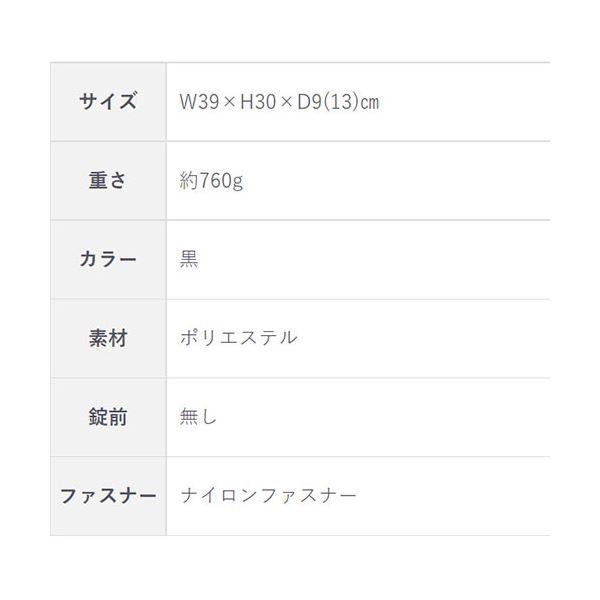 ●サイズ:W39×H30×D9(13)cm●重さ:訳760g●カラー:黒●生地:ポリエステル●ファスナー:ナイロンファスナー