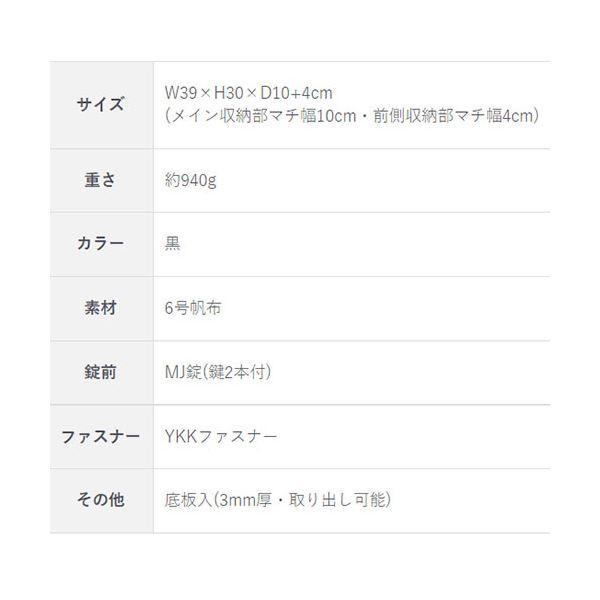 本商品はお取り寄せ商品のため、稀にご注文入れ違い等により欠品・遅延となる場合がございます。誠に恐れ入りますが、何卒ご了承ください。また、以下の場合には追加送料がかかる場合がございます。・沖縄、離島および一部地域への配送時 ・同梱区分が異なる商品の複数購入時 【同梱区分】:TS 1 【メーカー名】三実通商 【型番】MTM38397 カバンの総合セキュリティー商社の三実通商が企画し、日本国内の老舗カバンメーカーが制作したビジネスプロのための鞄。女性にもお使いいただきやすい取手肩掛けタイプが登場しました。生地は定番品の8号帆布メール用鞄より厚手の6号帆布を使用。帆布特有の温かみのある風合いで、使うほどに味わいが増していきます。メインの収納部には弊社オリジナルのMJ錠を取り付けました。防犯性能の高いディンプルキーで大切な書類等を守ります。B4書類がちょうど収まるサイズなので、A4ファイルも楽々入ります。●サイズ:W39×H30×D10+4cm(メイン収納部マチ幅10cm・前側収納部マチ幅4cm) ●重さ:約940g ●カラー:黒 ●生地:6号帆布 ●錠前:MJ錠(鍵2本付) ●ファスナー:YKKファスナー ●その他:底板入(3mm厚・取り出し可能)