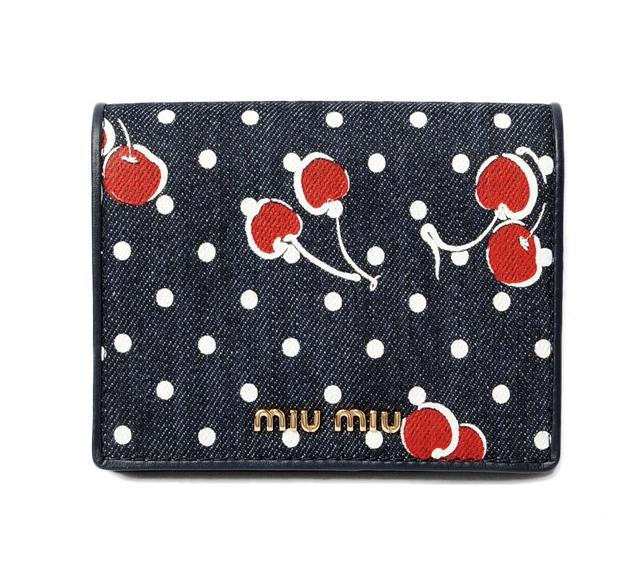 プラダの姉妹ブランドとして人気の高いMIU MIU ミュウミュウ。ミュウミュウより、人気の高いデニム/チェリーシリーズの財布です。愛らしいチェリーがモチーフです。カジュアルな服装にも合わせやすく、普段使いにも最適です。コンパクトながら機能的なミニ財布です。