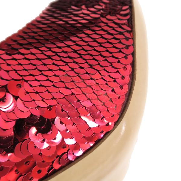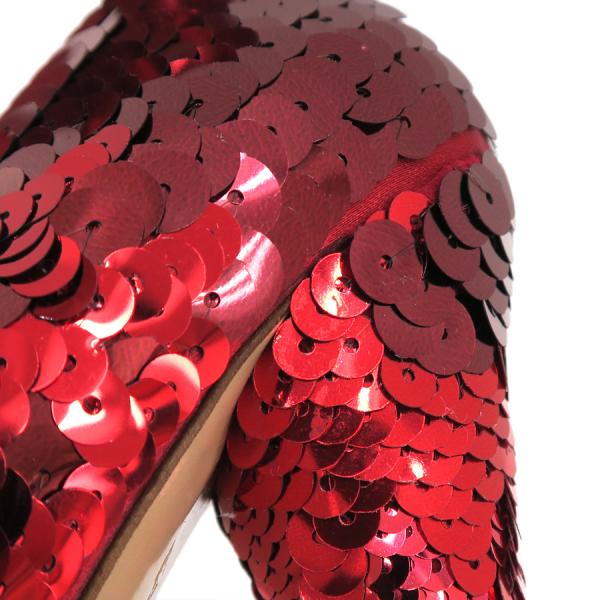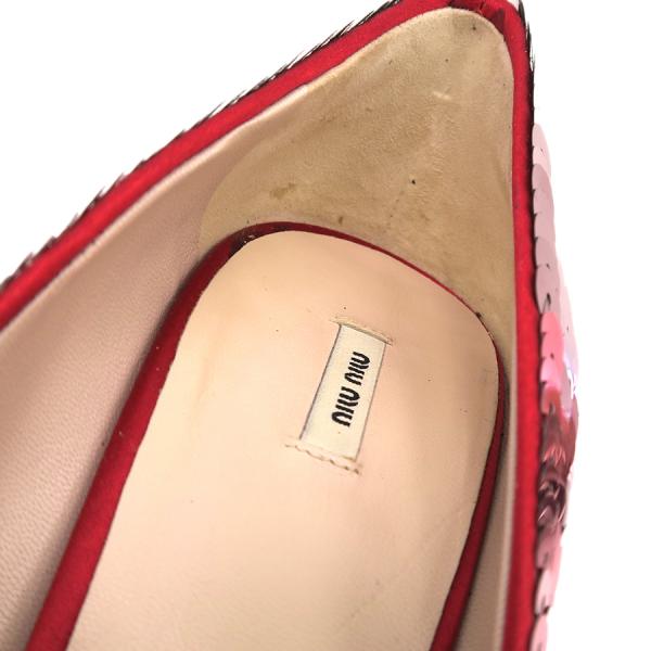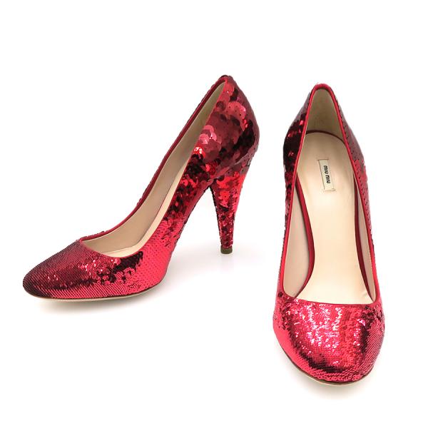 ミュウミュウからパーティ用のスパンコールパンプスが入荷しました。スパンコールも部分によって大きさが違い、とても華やかです。右足は、足底に汚れがあり、かかと下のスパンコールにはずれがあります。左足は、右側下にスレがあり、左側のヒール上のスパンコールに糊の跡があります。かかとの内側にも汚れが見られます。靴底は両足共ややスレがあります。ヒールが下に向かって細くなっています。どうぞお問い合わせくださいませ。