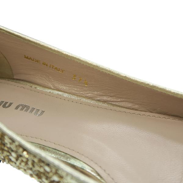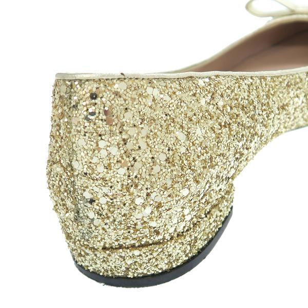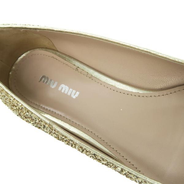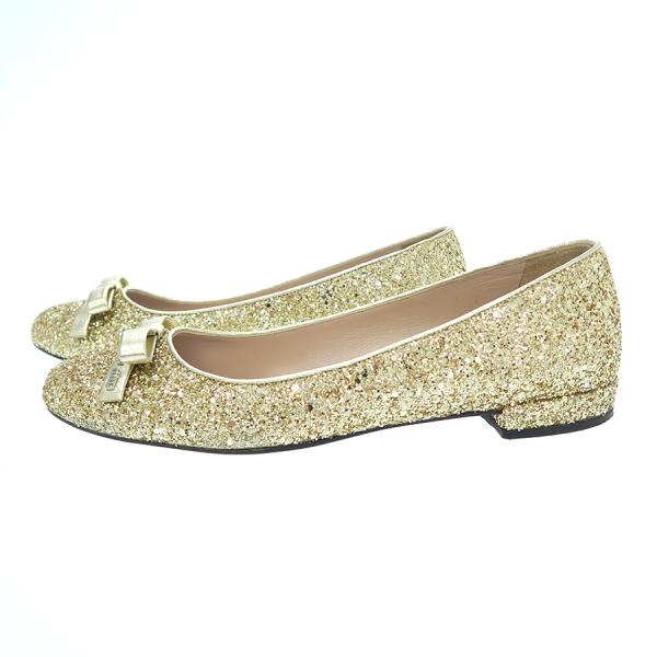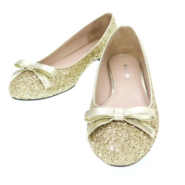 MIUMIUからゴールドのラメのパンプスが入荷しました。とてもきらびやかな1足です。リボンにMIUMIUのロゴも入っています。左の内底にシワが見られます。ラメは落ちやすいですが、外履き感はあまりないようです。どうぞお気軽にお問い合わせくださいませ。