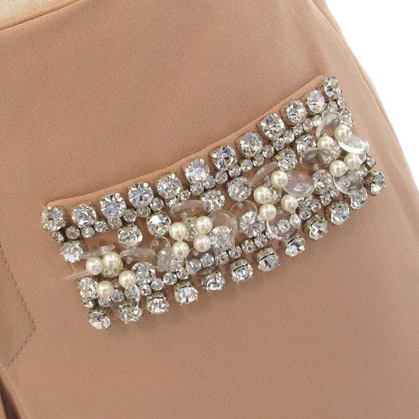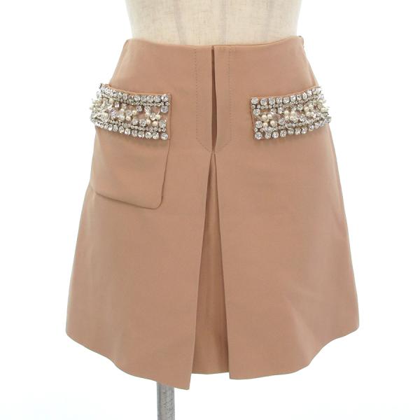 MIUMIUからスカートが入荷しました。オレンジっぽいピンク使いでポケットにビジューが装飾されたミニスカートです。左側に2つ糸つれがあり、汚れ(前のデザインの内側と外側、ウエストの裏地)が見られますのでBランクからのご案内です。他に大きなダメージはありません。普段使いにいかがでしょうか?