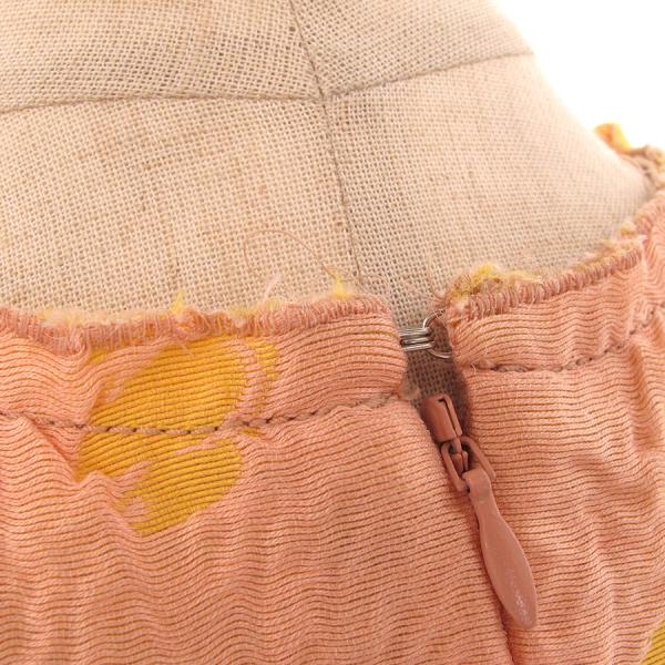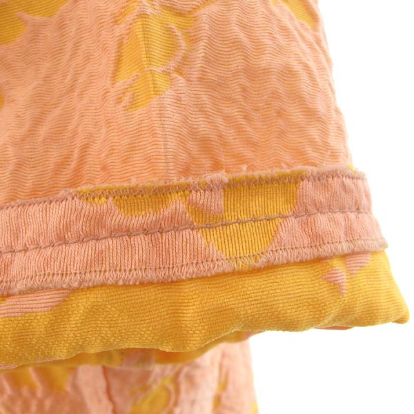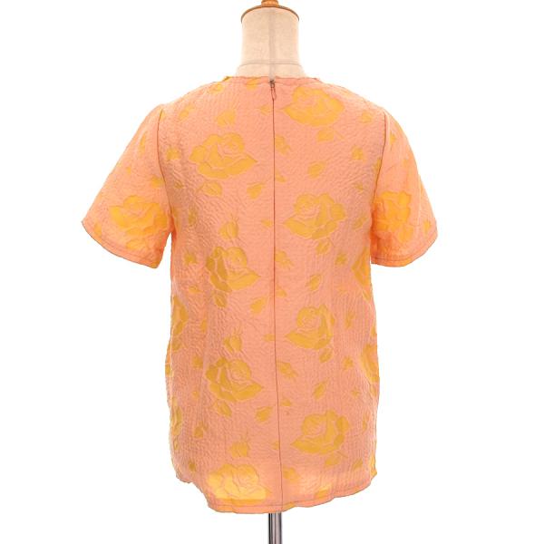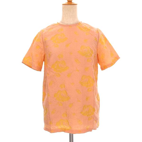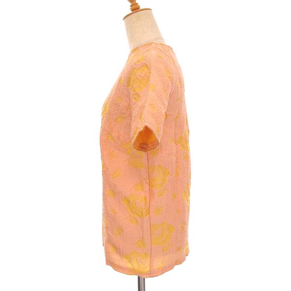 ■採寸#38 着丈61cm 肩34cm B87cm 袖22cm■素材56% 綿 34% ナイロン 10% 絹その他内側ディテール 100% 絹サーモンピンクにイエローの花柄が素敵なトップスが入荷致しました。ジャガード生地で襟回りや裾部分が切りっぱなしのデザインとなっております。全体的にスレ感があり、襟回りの切りっぱなしのデザインに糸ホツレ・スレ汚れ、右脇から胸部分に黒いスレ汚れ、袖口裏にスレ汚れや毛玉感、内側の両ダーツ部分に糸ホツレが見受けられますが、その分お買い得価格となっております!普段使いにいかがでしょうか?