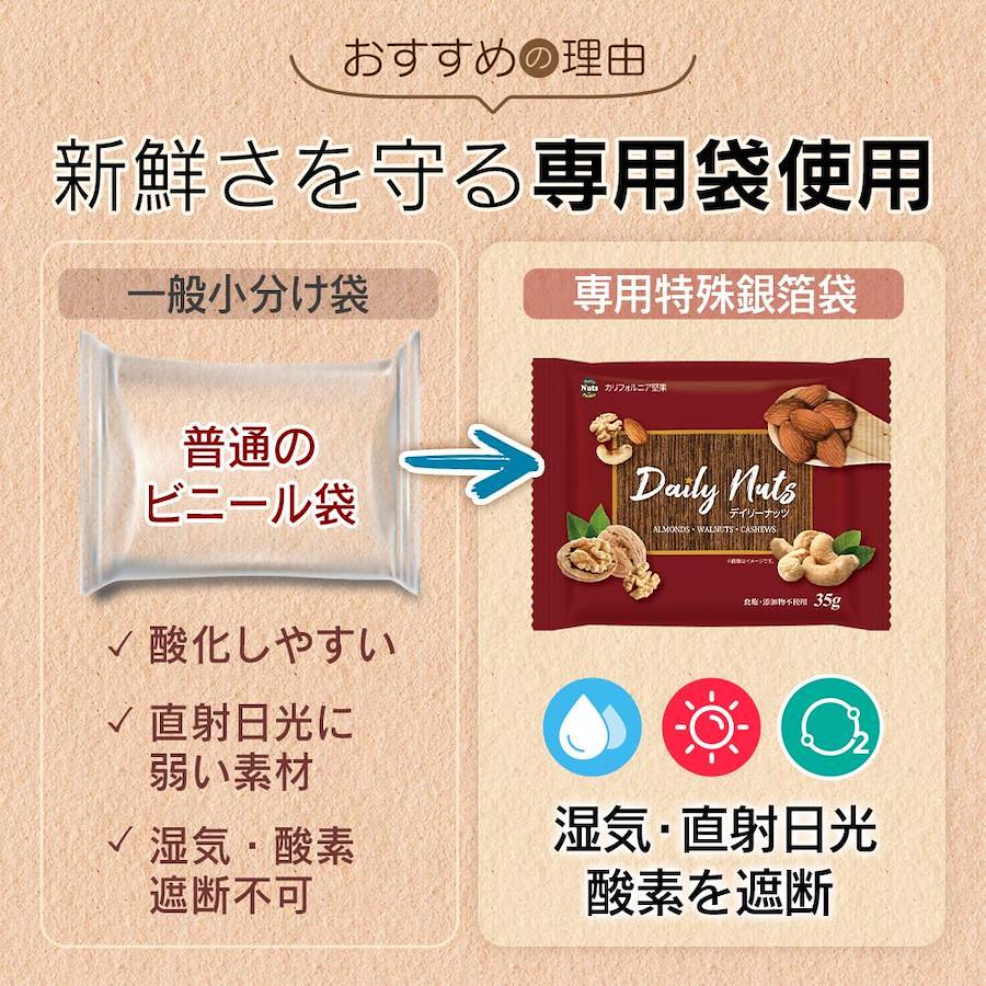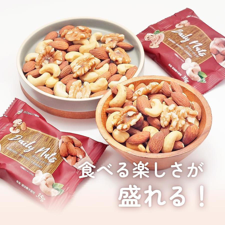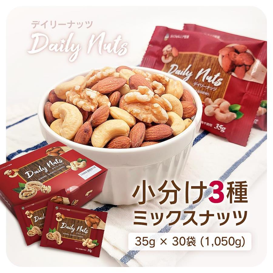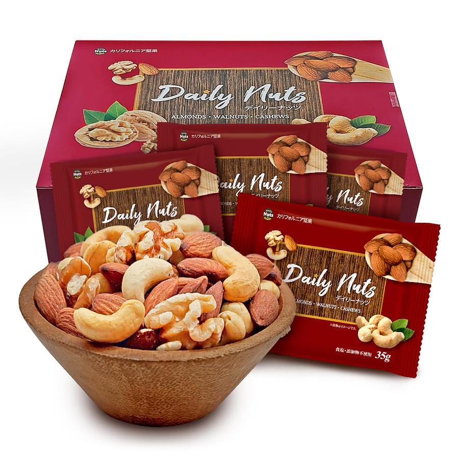 ● 名称:木の実 ● 内 容 量:1,050g(35g×30袋) ● 原材料名:アーモンド(アメリカ産)、くるみ、カシューナッツ ● 原産国:アーモンド(アメリカ産)、くるみ(アメリカ産)、カシューナッツ(インド又はベトナム産)くるみは生。● 栄養成分表示: (1袋(35g)当たり) エネルギー220kcal/たんぱく質6g/脂質20.5g/炭水化物6.8g /食塩相当量0.004g ● 賞味期限:小袋表面右記に記載 ● 保存方法:直射日光を避けて、常温で保存してください。※商品の特性上、重量に±1~5%ほどの誤差が生じてしまう場合がございます。あらかじめご了承ください。 ● 本品は窒素充填包装をしております。※本製品工場では、小麦、乳、落花生、カシューナッツ、牛肉、くるみ、鶏肉、バナナ、キウイフルーツを含む食品を生産しています。● 開封後はお早めにお召し上がりください。 ● 農作物のため色、形状にばらつきがあります。 ● ミックス商品のため内容にばらつきが生じることがあります。 ● 農産物ですのでまれに原材料の皮や殻が混入する場合があります。 ● 予告無く仕様を変更する場合があります。【重要】メーカーによる商品リニューアルに伴いパッケージ(内容量も含む)変更が行われた場合、新パッケージでお届け致します事ご了承願います。