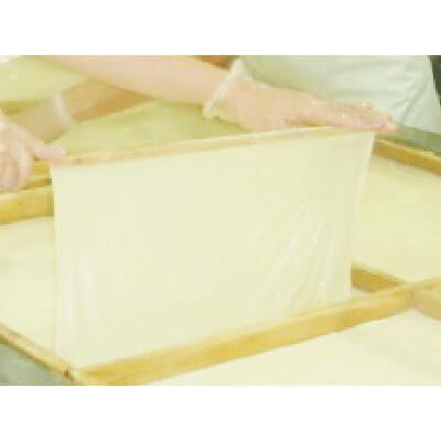 出来上がった豆乳を湯葉釜で熱し、表面に出来た皮膜を熟年した湯葉職人が一枚一枚丁寧に摘み上げると、美しい一枚の湯葉が完成いたします。湯葉工場の衛生面におきましてもFSSC22000を認定しており、常日頃から徹底した衛生状態で作業に取り組んでおります。