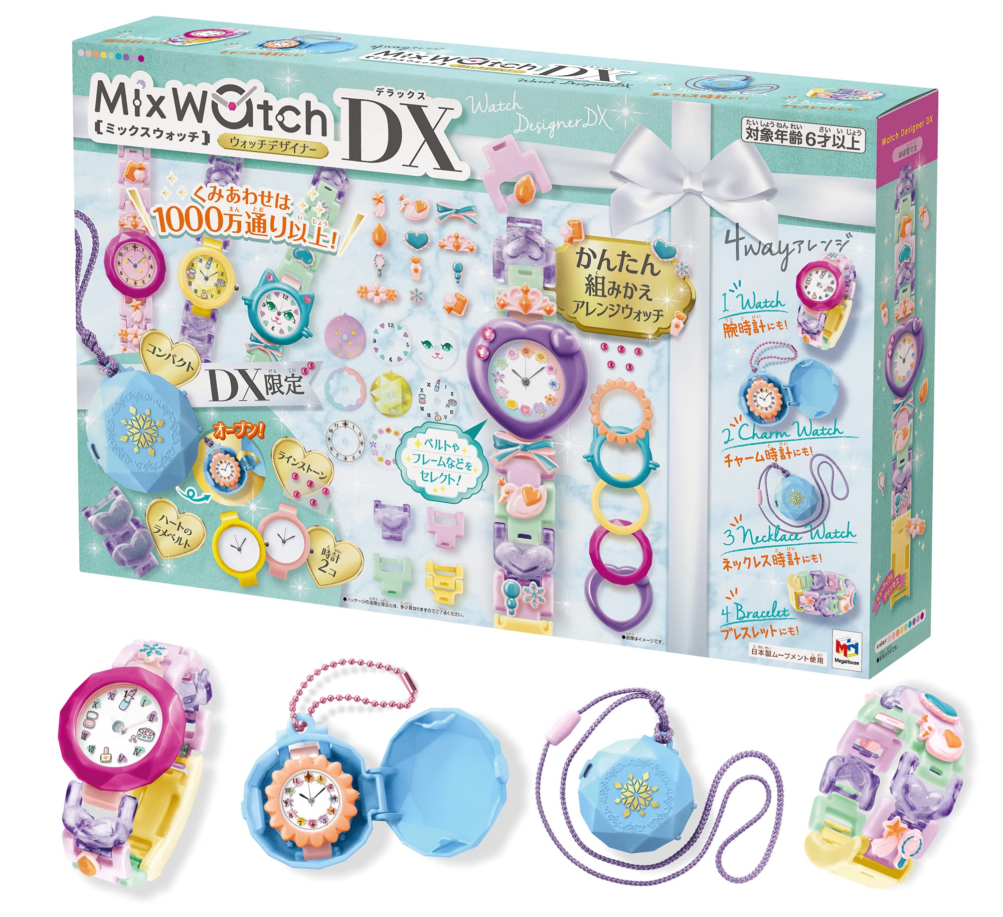 「MixWatch(ミックスウォッチ) ウォッチデザイナーDX」が登場!4WAY仕様で1腕時計2チャーム時計3ネックレス時計4ブレスレットが自由にカスタムして作れます!【遊び方】1.ベルトパーツを選んで本体につなげよう!好きな色のベルトパーツを選んでどんどん繋げます。適度な長さになったら次にバックルをつけます。2.フィルムのデザインを選ぶデザインフィルムは8種類!フレームは5種類の中から選んでセットします。3.デコパーツをつけよう!デコパーツは全部で12種類!好きなパーツを選んで、はめ込んだらオリジナルの腕時計のできあがり!【DXのポイント!】まずはコンパクトに本体をセット!→ネックレス紐でネックレス時計に!ボールチェーンでチャーム時計に! 梱包サイズ:37 x 24 x 6 cm 原産国:中国 対象年齢: 大人 サイズ: ワンサイズ