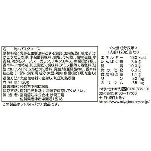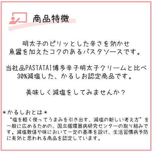 通常1-5営業日で発送国立循環器病研究センターが推奨する塩をかるく使って美味しさを引き出す減塩の考え方である「かるしお」認定商品になります。宮島醤油製品の「PASTATAI 博多辛子明太子クリーム」と比べて30%減塩しました。明太子のピリッとした辛さを効かせ、魚醤を加えたコクのあるパスタソースです。ゆでたてのパスタにかけて、お召し上がりください。