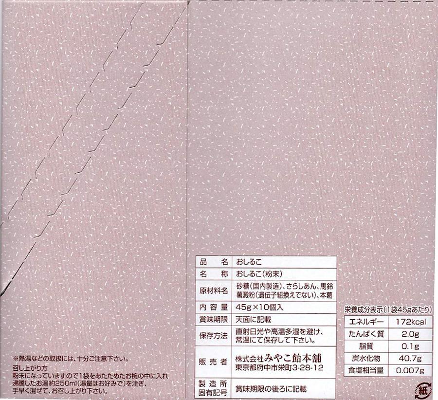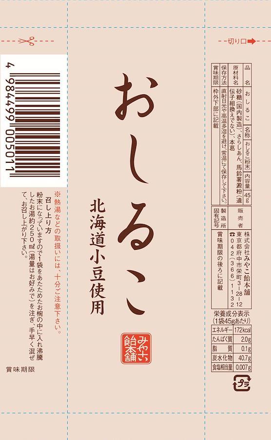 味にうるさい和菓子職人さんが営む和菓子専門店にて、長い間取り扱われている粉末タイプの"おしるこ"です。北海道小豆使用しており、さっぱりと飲みやすく仕上げました。1袋をあたためたお椀の中に入れ沸騰したお湯約250ml(湯量はお好み)を注ぎ、手早く混ぜて、お召し上がり下さい。食べ方提案:その1、ホットミルクで作ってみてください。その2、熱湯で作ったあとあら熱をとったあと凍らして"おしるこアイス"