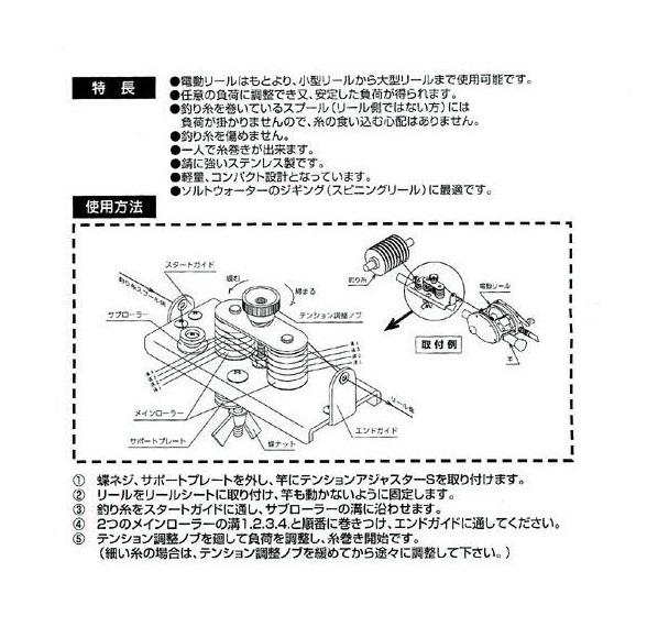 ジガーにこの1台!ジギングの際、スプールに糸が食い込むトラブルが防げます。テンションアジャスターSをロッドにセットするだけで、お望みのテンションでPEの糸を巻く事が可能です。□注意1細いPEやナイロンラインは、スリップしますので使用できません。2長時間巻かれると熱を持ちますので、PEは一度水に濡らしてからご使用下さい。