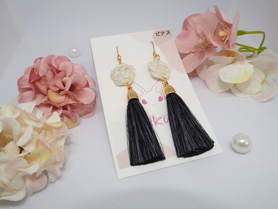 シルクの糸を染料で染めてタッセルにし、シルバー系の水引とあわせましたピアスでございます。梅結びの存在感がある上品でシックな仕上がりになりました。ハンドメイドの為、一点物となります。