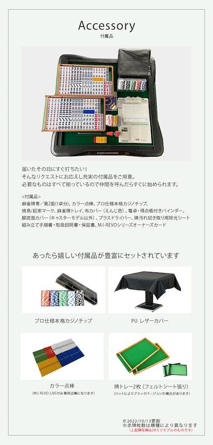 【ブラック枠 リフトチェア4脚セット】(チェア別便)MJ-REVO Proの静音性や操作性はそのままに、高い拡張性を備えたMJ-REVO Pro2が登場しました。 麻雀のゲーム設定は39種類。(3人麻雀花有りや、3人麻雀 3箇所セットor4箇所セットなどダイヤル1つで切り替え可能)特殊なゲームをご希望の場合はカスタムして出荷することも可能です、お気軽にご相談ください。 麻雀卓のサイズおよそW790mm ×D790mm ×H770mm・麻雀牌のサイズおよそ28mm ×21mm ×16.5mm、天板サイズおよそおよそ W635mm ×D635mm 電源 :50HZ/60HZ (東・西日本両対応) 定格電圧:AC100V 定格商品電力:120w 脚、牌なども含めた総重量はおよそ60kg弱。お届け時は3梱包でパーツに分かれてお届け致しますので、玄関などを通過する際は箱を立てて移動することが可能です。付属品一覧/ 28mm麻雀牌2面(1卓分) 点棒・焼鳥/起家マーク/ フ ェルト貼り麻雀牌トレー2枚/ 脚底面カバー/ プロ仕様本格カジノチップ/ 電卓付きバインダー/ カラー点棒セット/ 得点帳/ 写真入り日本語取扱説明書 付属チェアについて ◆全自動麻雀卓に最適なイス4脚セット ・1セットの内容は4脚です ・バックレストと座面にメッシュ生地を採用しているので通気性がよく、長期間麻雀を打っても快適 ・ガスリフト搭載なので、お好みの高さに調整が可能 ・安定性抜群の5本足キャスター付き ・ロッキング機能搭載で、角度が可動します ・耐荷重約90kg ◆チェア1脚あたりのサイズ 床から背もたれ上部までの高さ約90~100cm 床から座面までの高さ約45~55cm 座面横幅約48cm 座面奥行き約47cm 肘掛けを含めた横幅約57cm ■離島地域へのお届けについて■ ガス式の高さ調整機能付きのため航空機に積載できない荷物となります。 船便・陸送便利用のためお届けにお時間がかかります。 麻雀卓とお届けが前後する場合があります