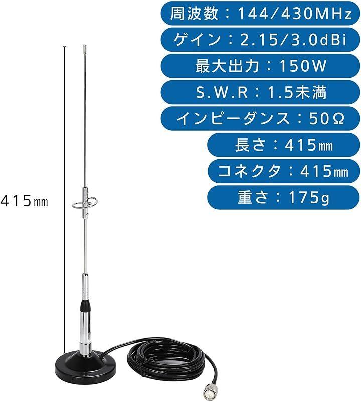 「高性能アンテナ」このモービルアンテナは、144/430MHzの周波数帯に対応し、アマチュア無線の通信品質を向上させます。