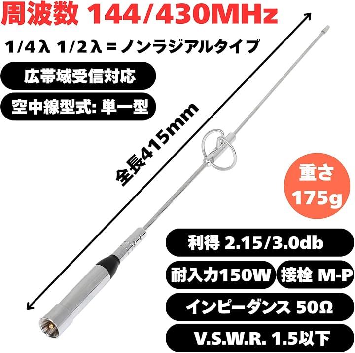 「周波数」 144/430MHz(1/4λ 1/2λ=ノンラジアルtype) 「利得」 2.15/3.0db 「耐入力」 150W